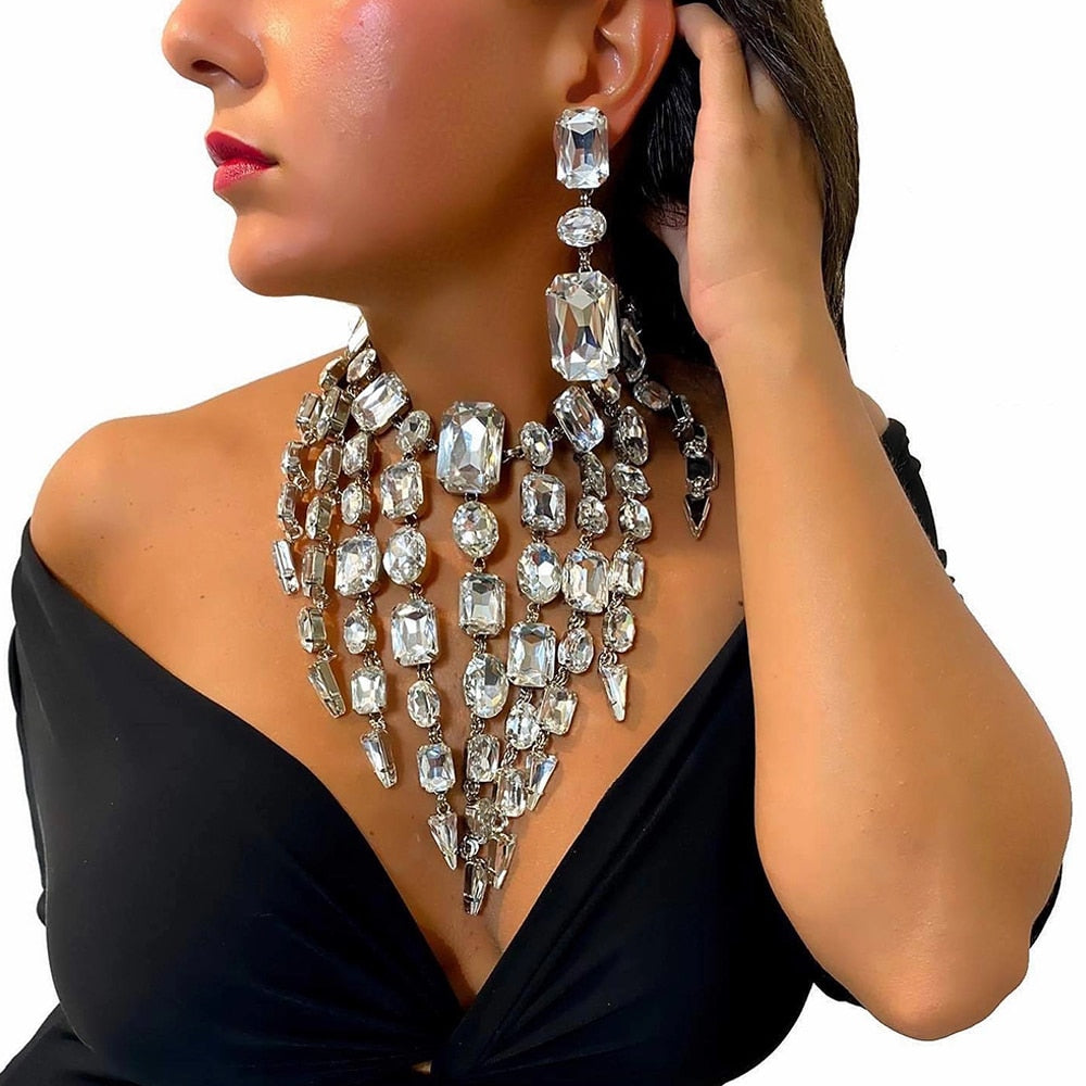 Tassel Square Rhinestone Jewelry Set for Women Exaggerate Summer Oversize Accessories Crystal Necklace Earrings Set