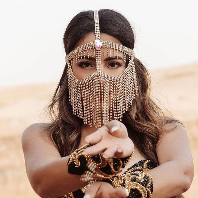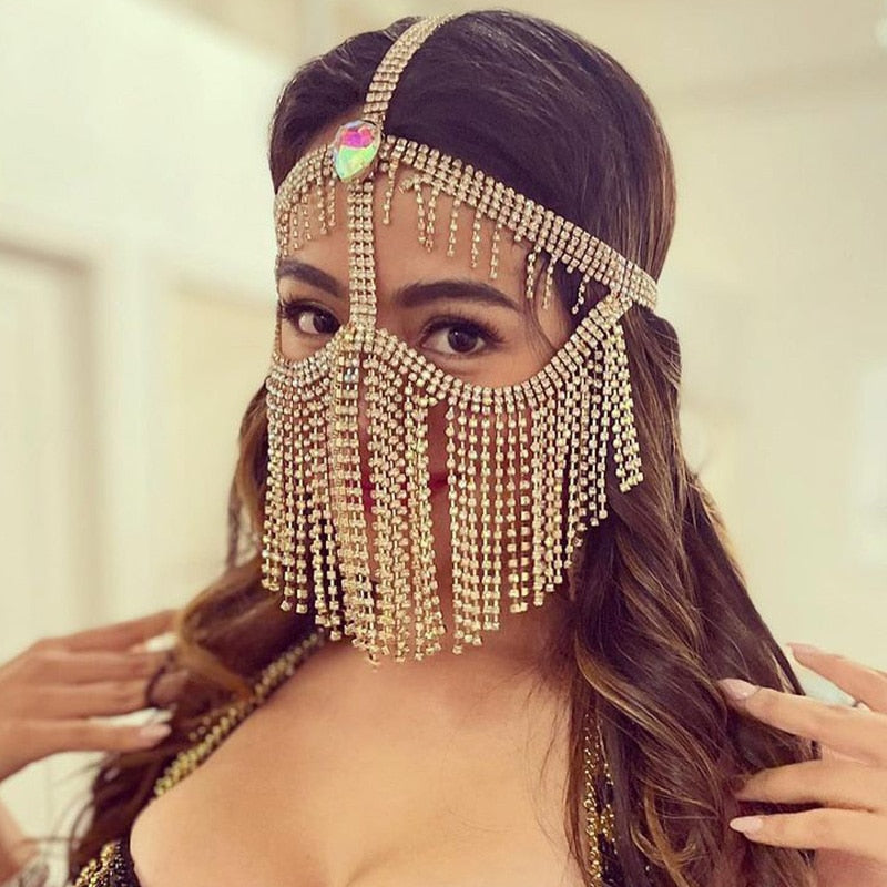 Crystal Rhinestone Face Mask Chain Tassel Veil Halloween Masquerade Jewelry
