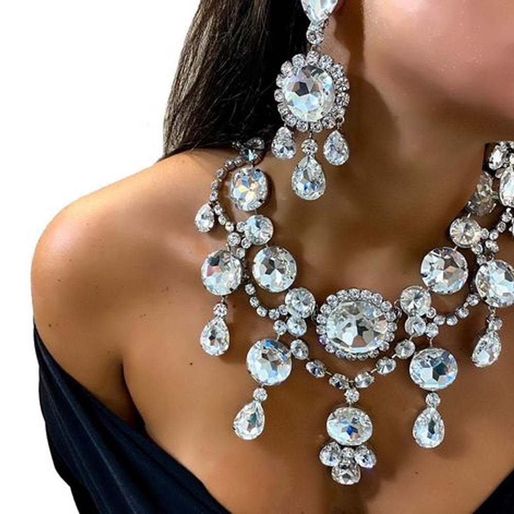 Fashion Crystal Set Necklace Earrings Jewelry Choker Rhinestone Collar Necklace Earrings