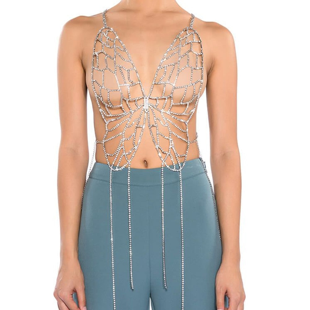 Hollow Butterfly Crystal Bra Chain Harness Beach Accessories Bikinis Lingerie Rhinestone Body Jewelry Rave Clothing Body Chain