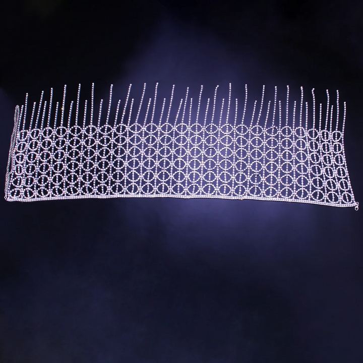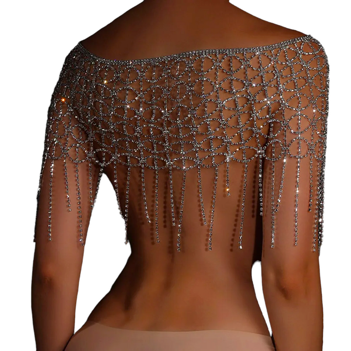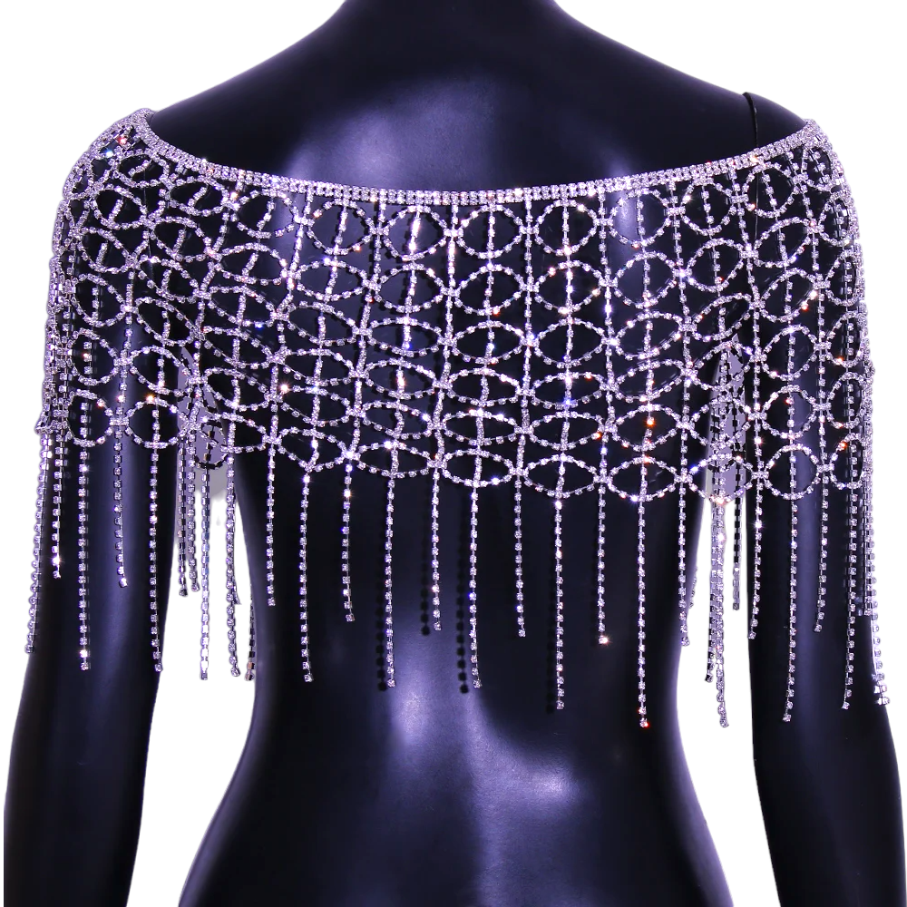Type and Shape: This jewelry falls under the category of body jewelry, specifically designed as belly chains. Its design takes the form of a shawl chain strass, enhancing the wearer's shoulders with a dazzling display of rhinestones. It's more than just an accessory; it's a bold statement piece.