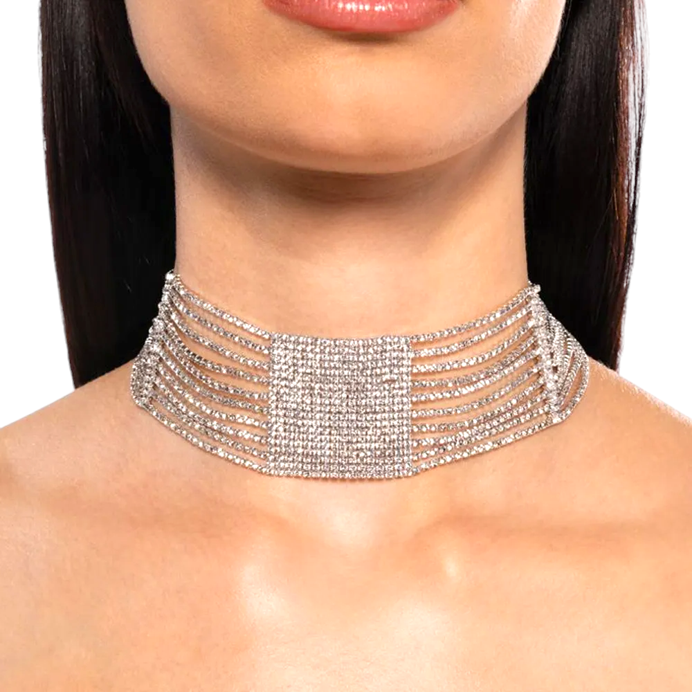 Shape Pattern and Shape: Adorned with a geometric shape pattern, the Multilayer Rhinestone Choker Necklace takes on the form of a chunky chain choker. This unique shape adds a bold and modern touch, enhancing the necklace's visual appeal.