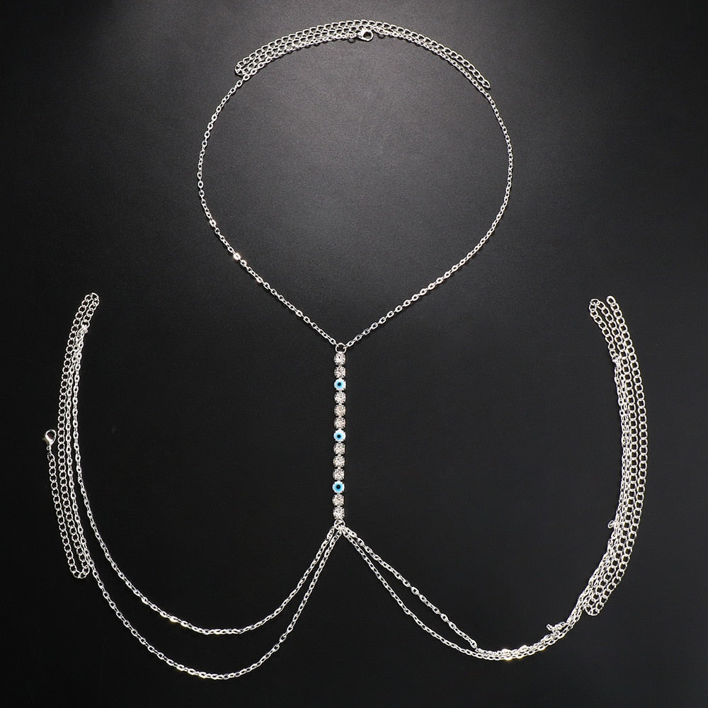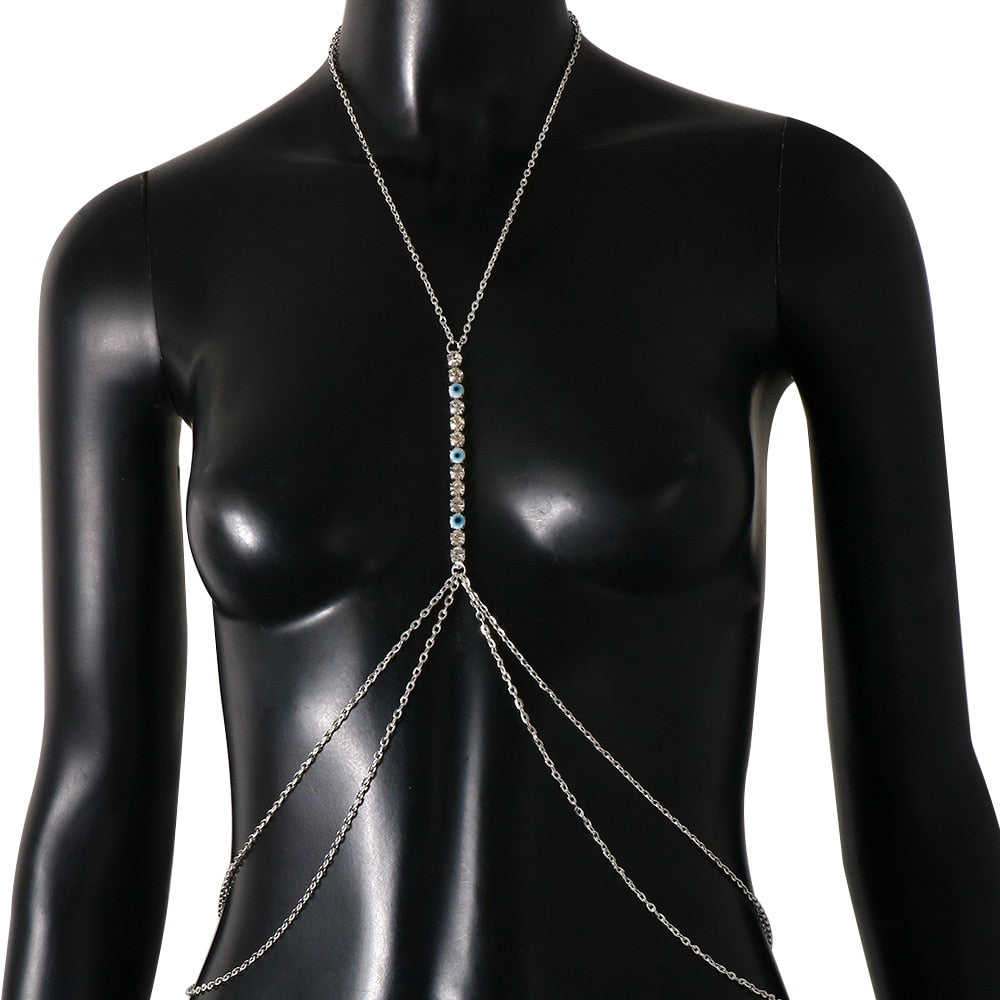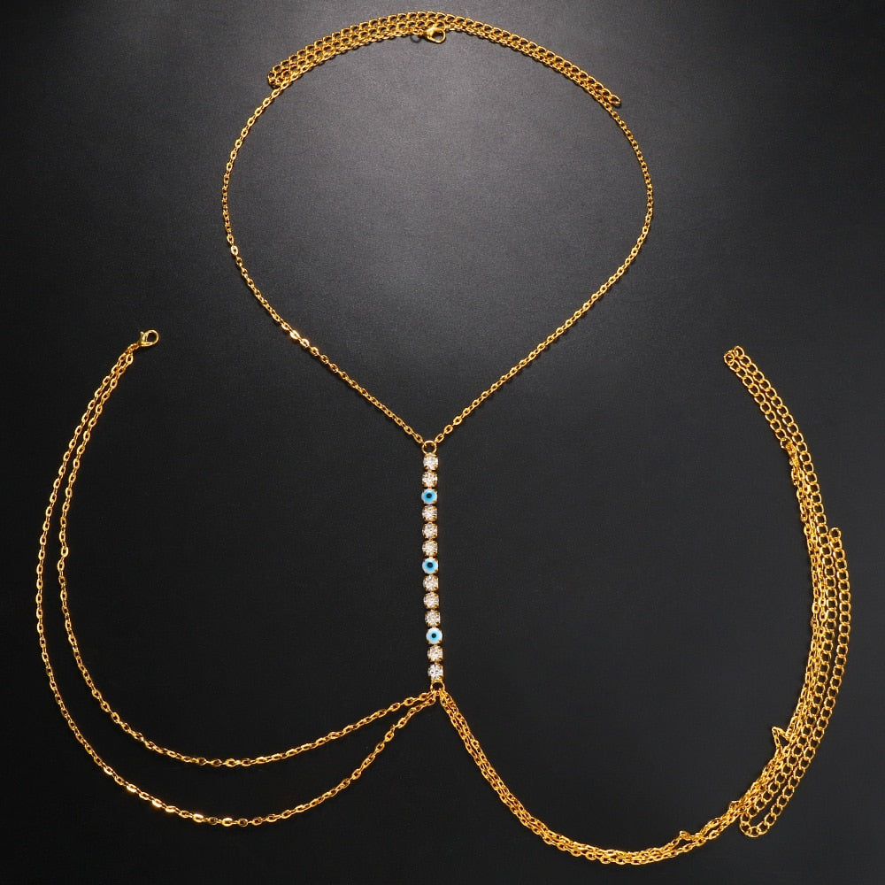Evil Eye Crystal Chest Chain Belly Chains for Women Rhinestone Body Jewelry Bikini Accessories Body Chain