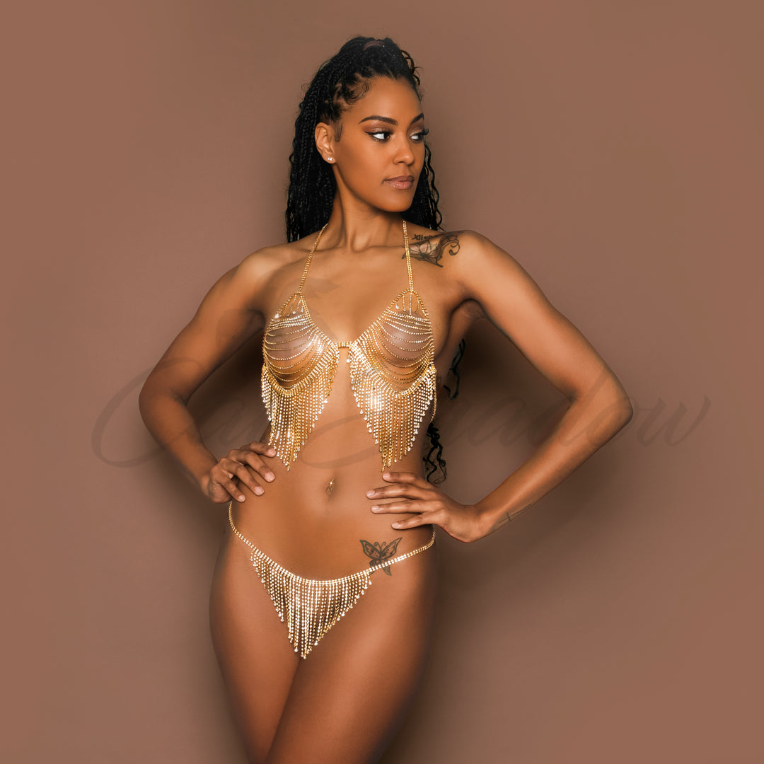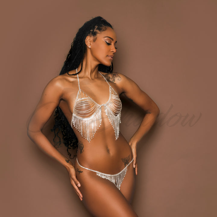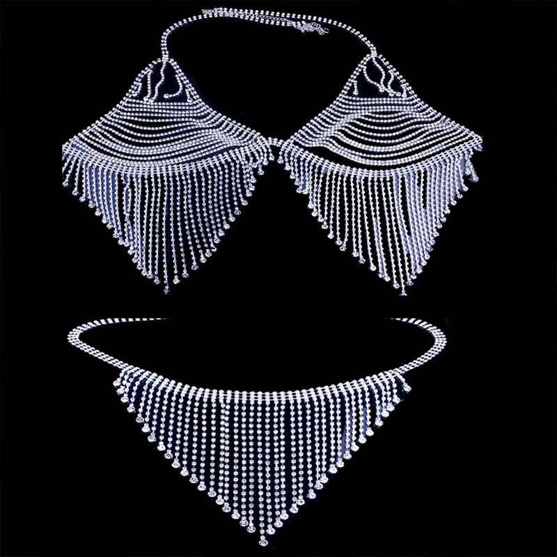 This Tassel Jewelry Women Set is composed of rhinestones and alloy and is available in One Size. The extended chain on the bra and panties can be adjusted to fit any woman. The sequin design makes it an ideal choice for a night club party, dance party, costume party, or the beach. This shimmering body chain jewelry is perfect for daily or evening wear, enabling you to create an alluring and unique look. It also makes a great anniversary, graduation, or birthday gift.